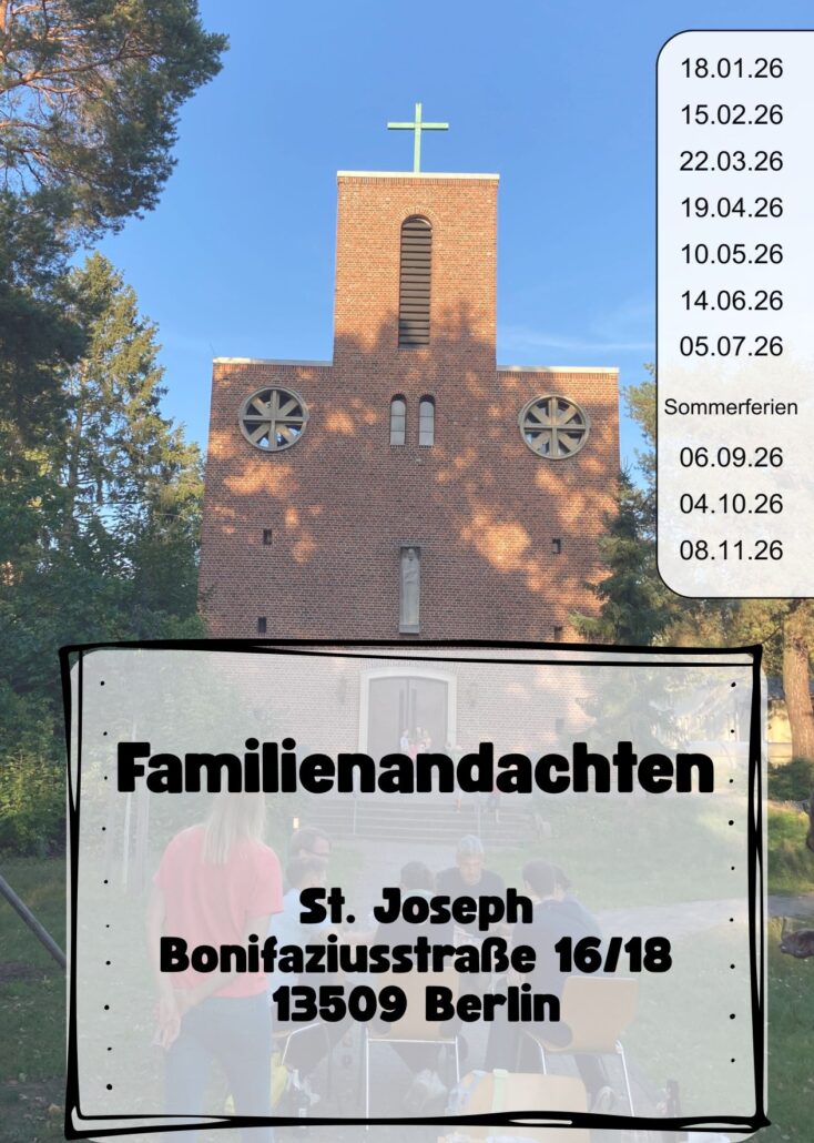 Zusätzlich feiern wir monatlich eine Familienandacht um 10:00 Uhr in St. Joseph mit Familien im Kita und frühen Grundschulalter. Anschließend wird herzlich zum Familiencafé eingeladen, einer Möglichkeit der Begegnung im Gemeindehaus, bei Speis und Trank.