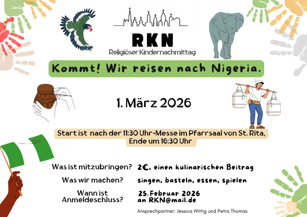 Neben der Religiösen KinderWoche (RKW) haben sich in St. Rita auch die Religiösen KinderNachmittage etabliert. Dieses Angebot ermöglicht den Kindern, auch nach der RKW in Kontakt zu bleiben und 1x pro Quartal einen schönen gemeinsamen Nachmittag, bei Spiel und Spaß, aber auch thematischen Einheiten, Singen und Basteln und gemeinsamem Essen zu verbringen.